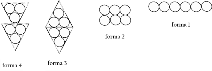 Quiero que hagamos juntos un pequeño experimento. Para el experimento, deben conseguir seis monedas de tamaño idéntico (en Shabat, busquen anillos o ‘potes’). Ahora, intenten ordenarlos de la forma que les parezca más bonita y adecuada. Supongo que algunos elegirán ordenarlos en forma de línea recta [como en el dibujo A], otros preferirán la forma del rectángulo [como en el dibujo B], y otros los ordenarán como dos triángulos unidos [como en los dibujos C-D]: