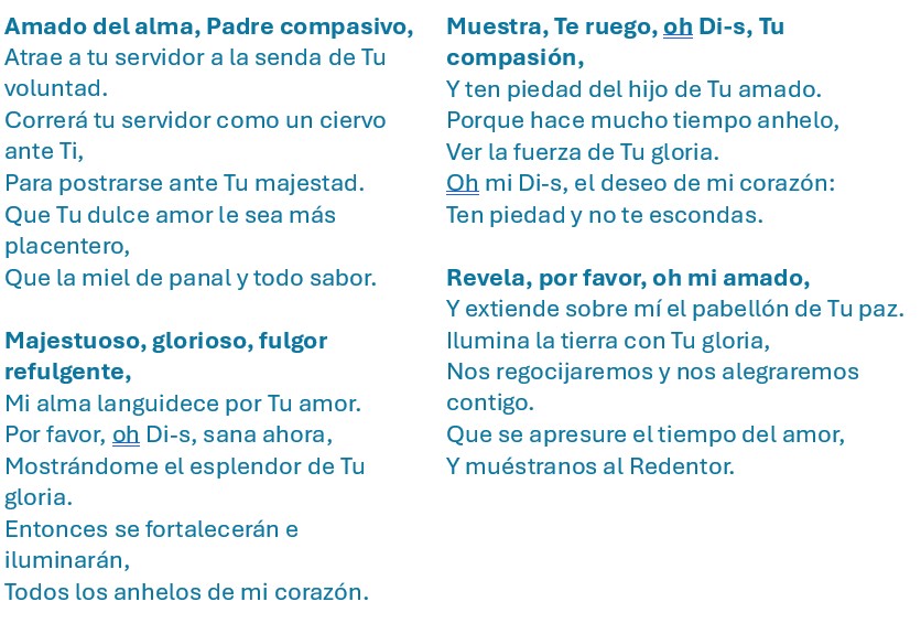 | Amado del alma, Padre compasivo, Atrae a tu servidor a la senda de Tu voluntad. Correrá tu servidor como un ciervo ante Ti, Para postrarse ante Tu majestad. Que Tu dulce amor le sea más placentero, Que la miel de panal y todo sabor. Majestuoso, glorioso, fulgor refulgente, Mi alma languidece por Tu amor. Por favor, oh Di-s, sana ahora, Mostrándome el esplendor de Tu gloria. Entonces se fortalecerán e iluminarán, Todos los anhelos de mi corazón. | Muestra, Te ruego, oh Di-s, Tu compasión, Y ten piedad del hijo de Tu amado. Porque hace mucho tiempo anhelo, Ver la fuerza de Tu gloria. Oh mi Di-s, el deseo de mi corazón: Ten piedad y no te escondas. Revela, por favor, oh mi amado, Y extiende sobre mí el pabellón de Tu paz. Ilumina la tierra con Tu gloria, Nos regocijaremos y nos alegraremos contigo. Que se apresure el tiempo del amor, Y muéstranos al Redentor. |