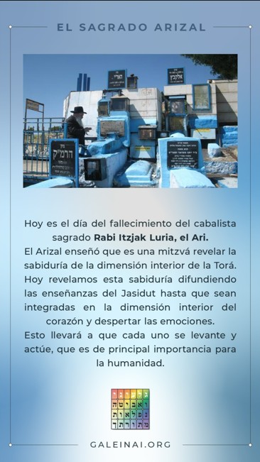 Este miércoles será el 5 de Av, el día del fallecimiento del Santo Arizal. El Arizal sabía cómo comunicarse con todo lo que existe. Rabí Jaim Vital relató que vio con sus propios ojos que el Arizal incluso se comunicaba con objetos inanimados, como las piedras. Cuando veía la llama de una vela, también podía comunicarse con ella, porque una llama tiene su propia historia que contar. Asegúrense de ver la clase del Rabino Ginsburgh a continuación, sobre el secreto de la contracción del Arizal y cuán relevante es para nuestra vida diaria.