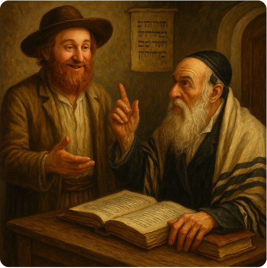 Cuando el Baal Shem Tov entró en la habitación de retiro del erudito, que estaba en un rincón de la sinagoga, le preguntó por su estado de salud y si tenía lo necesario para sus necesidades. El erudito no le prestó atención al Baal Shem Tov, que vestía como un simple campesino. El Baal Shem Tov repitió sus preguntas varias veces, hasta que el erudito se enojó con él y le señaló la puerta con un gesto, indicándole que se fuera.