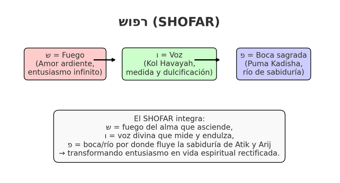 La פ de shofar representa la boca sagrada de Arij Anpín, donde se revela el Da’at supremo oculto. Esta boca es el canal por el cual el fuego del entusiasmo (ש) se rectifica y se convierte en un río de sabiduría que fluye desde el Notzer Jésed de Atik hacia Jojmá, a través de las trece cualidades de misericordia.