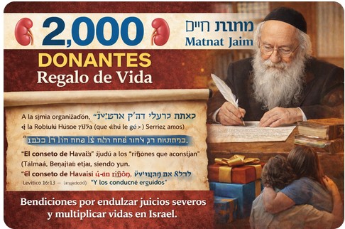 La organización “Matnat Jaim” generó una revolución inconcebible en el campo de las donaciones de riñón, tal como fue la visión del Rabino Haber zt”l (de bendita memoria), la cual se cumple hoy en una forma de “mayor que en su vida”. Personalmente, a lo largo de los años, muchos de mis alumnos donaron un riñón en el marco de la organización, y en los últimos dos años yo mismo tuve el mérito de recibir el acompañamiento dedicado a lo largo de todo el proceso que atravesé, y no hay límite para mi agradecimiento por ello.