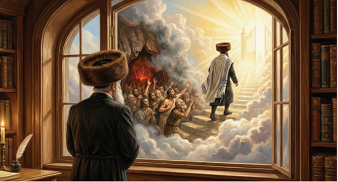 Al oír la proclamación, almas santas y puras se reunieron para saludar al tzadik. Pero cuando llegó el Rebe Moshe Leib, rodeado de las almas de los justos, de repente se oyó un grito que iba de un extremo al otro del mundo. En ese momento, el tzadik abandonó la compañía sagrada y corrió hacia el sonido, hasta llegar a la entrada de Guehenom y entró de inmediato.
